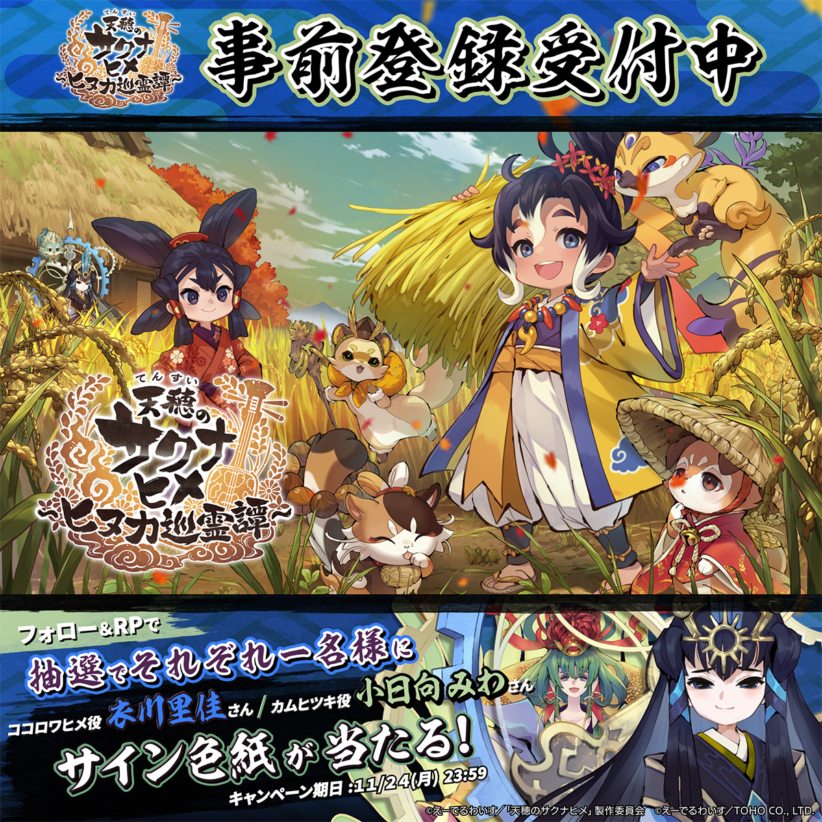 2025.11.21 【ココロワヒメ(CV:衣川里佳)/カムヒツキ(CV:小日向みわ)】キャストサイン入り色紙プレゼントキャンペーン実施中! 天穂のサクナヒメ~ヒヌカ巡霊譚~公式Xにて、キャストサイン入り色紙が当たるキャンペーンを実施中! 天穂のサクナヒメ~ヒヌカ巡霊譚~公式Xをフォロー&該当ポストをリポストすることで参加可能! 抽選でそれぞれ一名様に「ココロワヒメ役:衣川里佳さん」・「カムヒツキ役:小日向みわさん」のサイン入り色紙をプレゼントしますので、是非チェックしてみてくださいね。 ▼「ココロワヒメ/カムヒツキ キャラクター紹介PV」公開中!