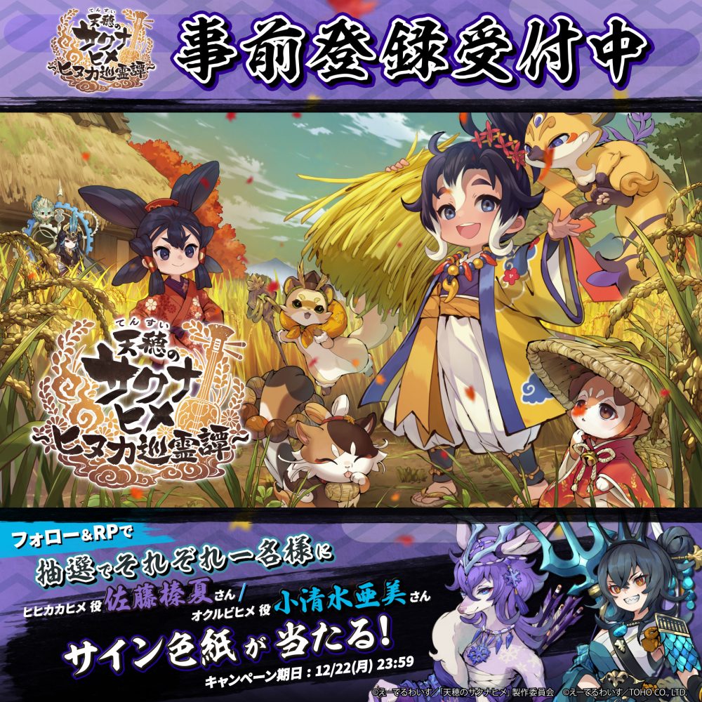 2025.12.19 【ヒヒカカヒメ(CV:佐藤榛夏)/オクルビヒメ(CV:小清水亜美)】キャストサイン入り色紙プレゼントキャンペーン実施中! 天穂のサクナヒメ~ヒヌカ巡霊譚~公式Xにて、キャストサイン入り色紙が当たるキャンペーンを実施中! 天穂のサクナヒメ~ヒヌカ巡霊譚~公式Xをフォロー&該当ポストをリポストすることで参加可能! 抽選でそれぞれ一名様に「ヒヒカカヒメ役:佐藤榛夏さん」・「オクルビヒメ役:小清水亜美さん」のサイン入り色紙をプレゼントしますので、是非チェックしてみてくださいね。 ▼「ヒヒカカヒメ/オクルビヒメ キャラクター紹介PV」公開中! https://youtu.be/DWdvta_R31c