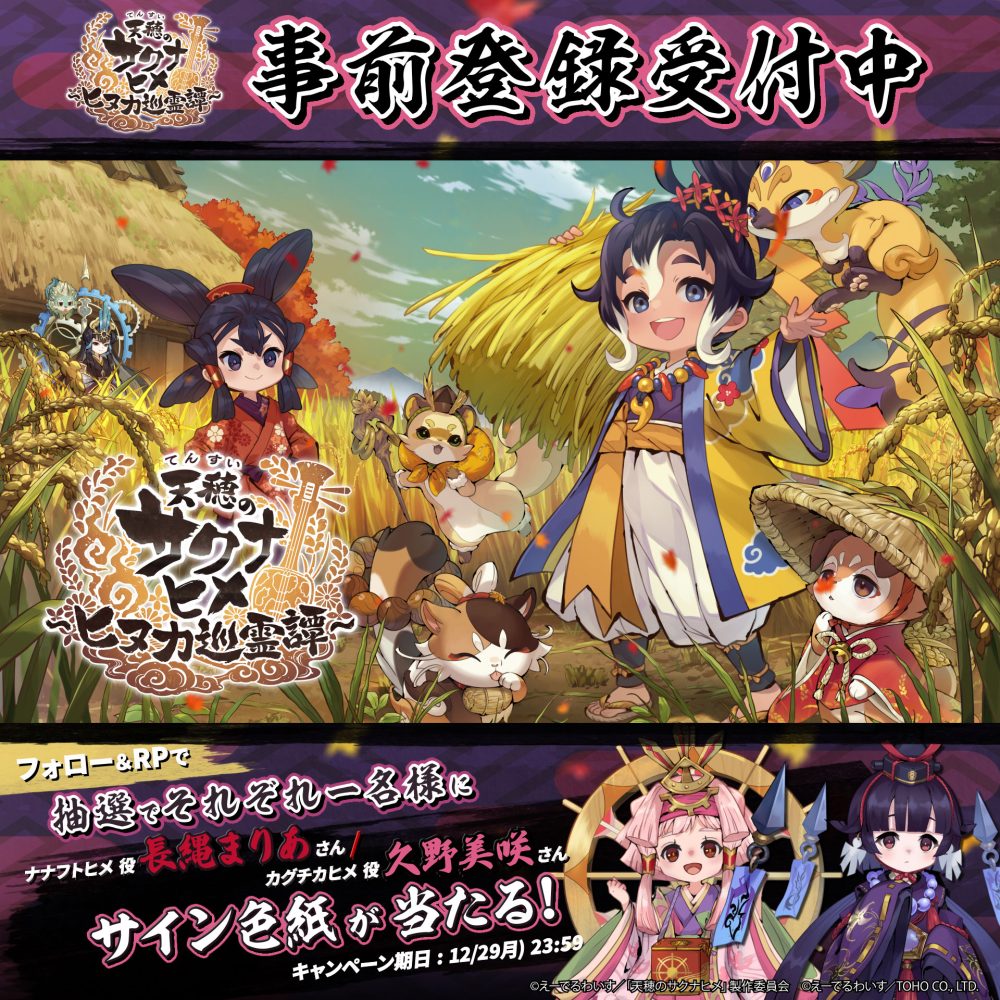 2025.12.26 【ナナフトヒメ(CV:長縄まりあ)/カグチカヒメ(CV:久野美咲)】キャストサイン入り色紙プレゼントキャンペーン実施中! 天穂のサクナヒメ~ヒヌカ巡霊譚~公式Xにて、キャストサイン入り色紙が当たるキャンペーンを実施中! 天穂のサクナヒメ~ヒヌカ巡霊譚~公式Xをフォロー&該当ポストをリポストすることで参加可能! 抽選でそれぞれ一名様に「ナナフトヒメ役:長縄まりあさん」・「カグチカヒメ役:久野美咲さん」のサイン入り色紙をプレゼントしますので、是非チェックしてみてくださいね。 ▼「ナナフトヒメ/カグチカヒメ キャラクター紹介PV」公開中! https://youtu.be/vP6–MwCWnA