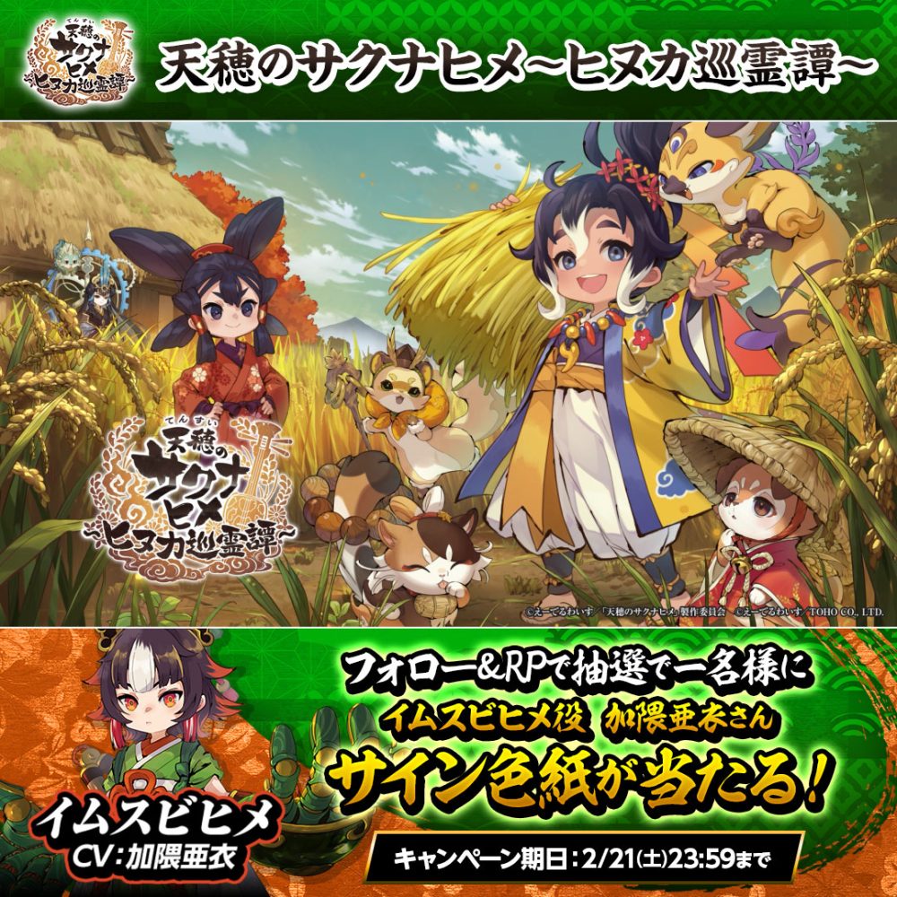 抽選で一名様に「イムスビヒメ役:加隈亜衣さん」のサイン入り色紙をプレゼントしますので、是非チェックしてみてくださいね。