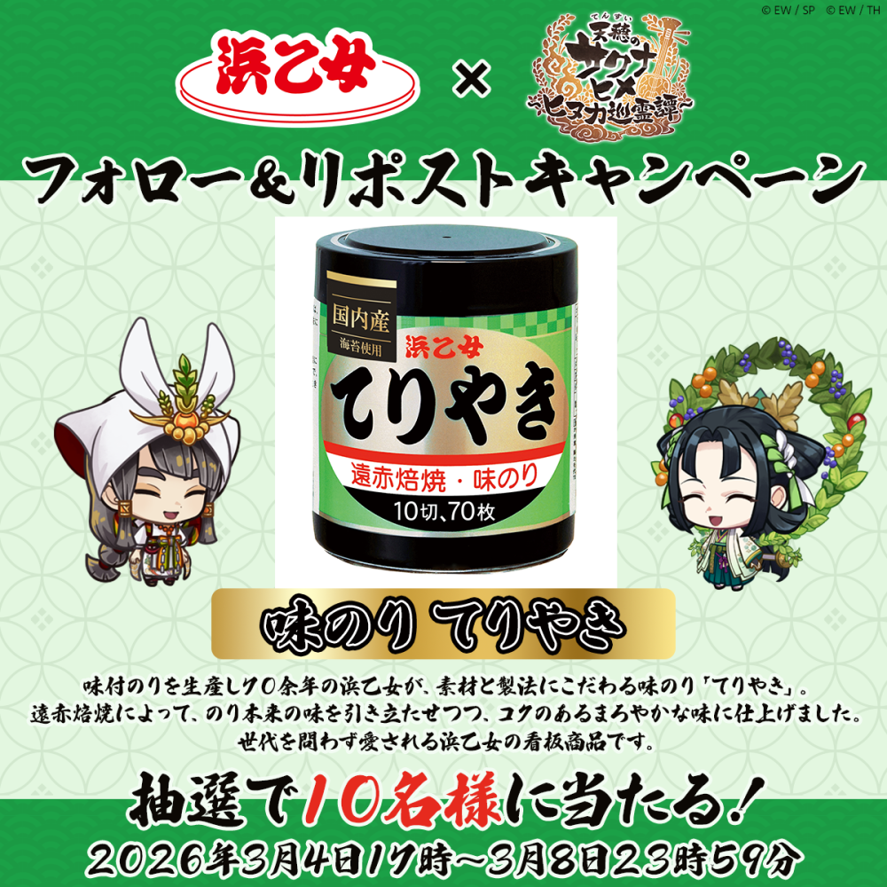 本日より、公式Xにて浜乙女 ×『天穂のサクナヒメ~ヒヌカ巡霊譚~』プレゼントキャンペーンを実施中!