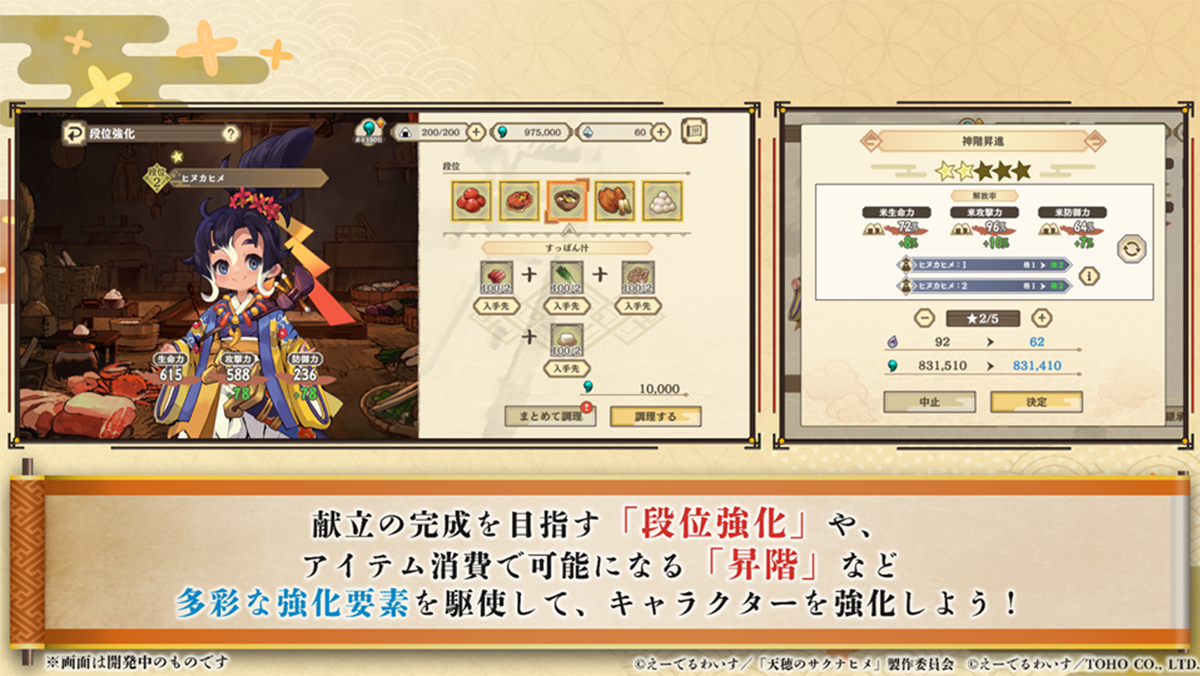 「量・美しさ・味・香り・硬さ・粘り」の六項目からなる米の品質によって、キャラクターのステータスである「生命力・攻撃力・防御力」の上昇値が変化します。