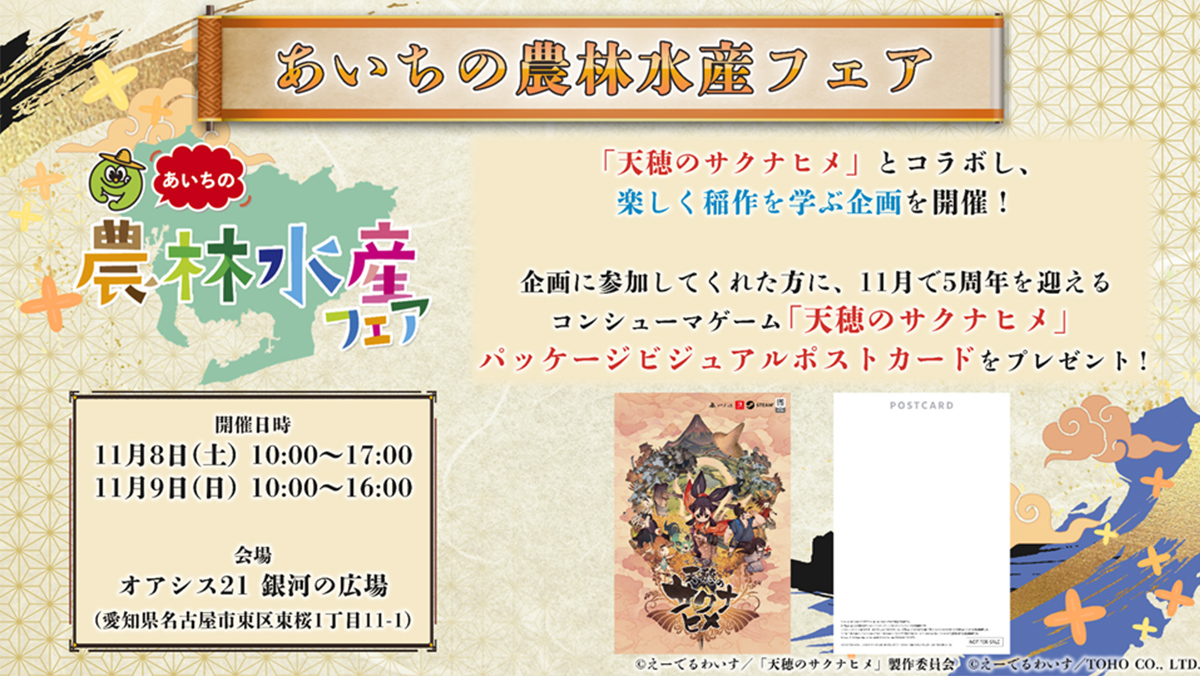 11月8日と9日に愛知県名古屋市・オアシス21 銀河の広場にて開催される「あいちの農林水産フェア」で、『天穂のサクナヒメ』とコラボし、楽しく稲作を学ぶ企画を開催します!