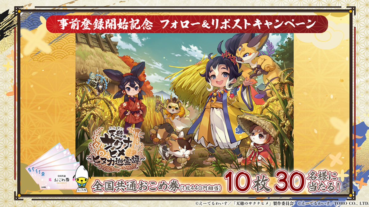 公式Xにて「天穂のサクナヒメ~ヒヌカ巡霊譚~」事前登録開始記念キャンペーンを開催中!公式Xをフォロー&該当のポストをリポストすることで、抽選で30名様に「全国共通おこめ券10枚(4,400円分)」が当たります!キャンペーンの開催期間は2025年11月7日(金)13:00から2025年11月13日(木)23:59までとなっておりますので、ぜひ奮ってご参加ください。