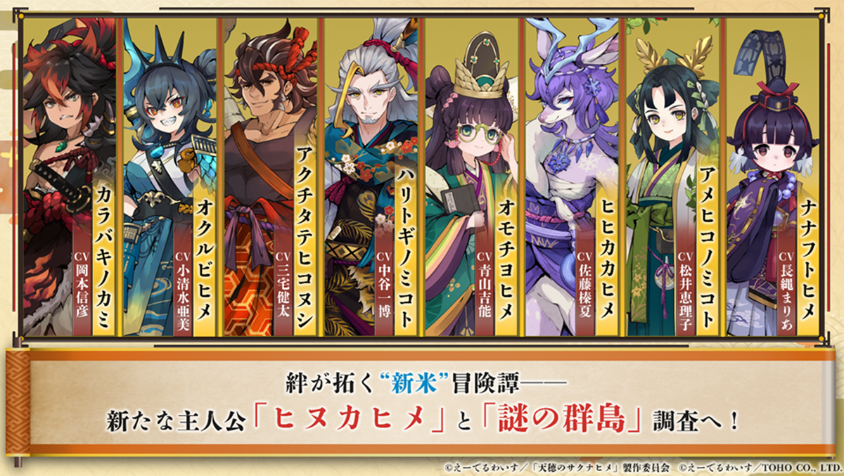 本作では「サクナヒメ」や「ココロワヒメ」など、原作をプレイしたり、アニメを視聴いただいた方にはお馴染みのキャラクターたちに加えて、もう一人の主人公として「ヒヌカヒメ」、そしてヒヌカの相棒的存在となる「コヨミ」などの様々なキャラクターたちが新たに登場します。各キャラクターを担当する豪華声優陣にもぜひご注目ください。